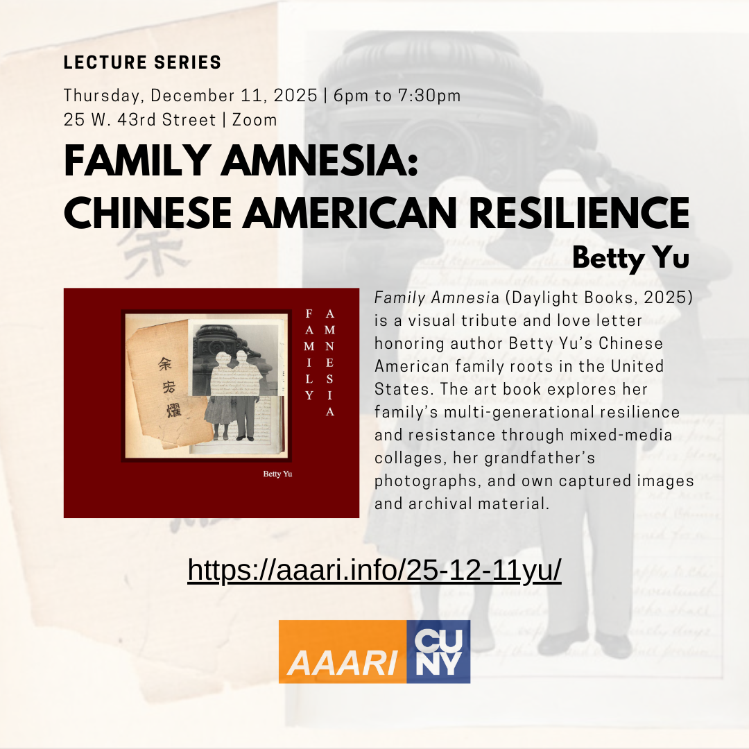Upcoming book talk and signing of my new art and photography book, Family Amnesia: Chinese American Resilience, published by Daylight Books at Asian American / Asian Research Institute @ The City University of New York (at 25 West 43rd Street, Room 1000 in Midtown Manhattan, NYC) on Thursday, December 11th at 6pm. RSVP HERE.